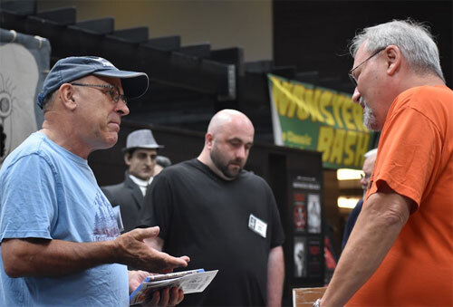 A photo from this past June's MONSTER BASH CONVENTION. It's long-time attendee Chris with veteran Bash Staffer, Bob Pellegrino discussing, classic monster movies....what else? Photo by Kevin Slick.