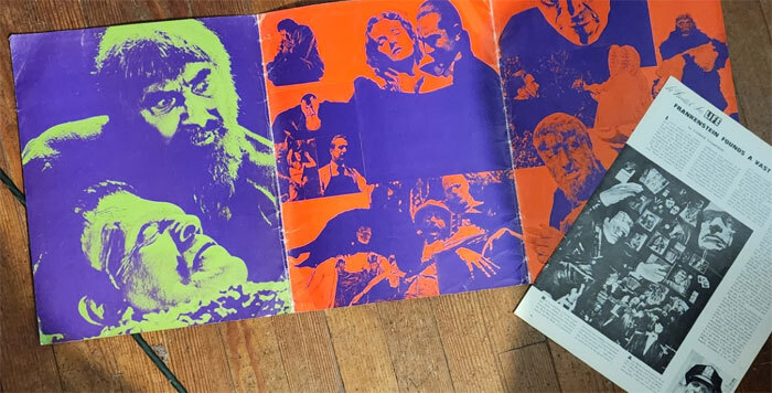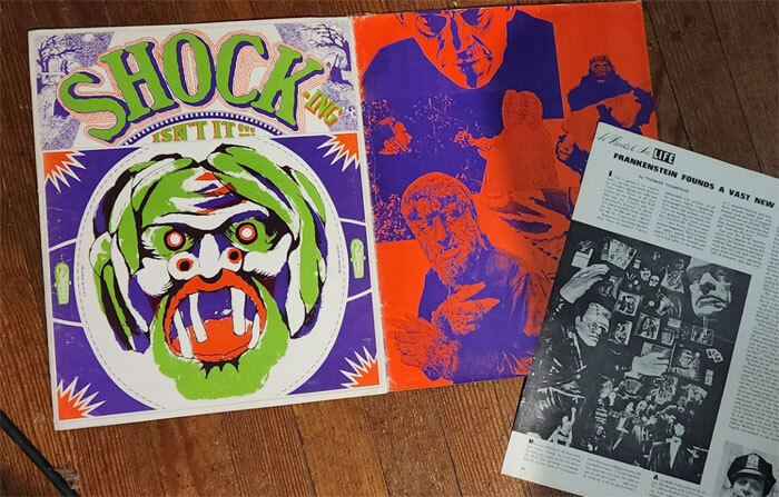 Besides the giant tri-fold images it included a copy of LOOK magazine from September 8, 1968, touting the MONSTER BOOM with Boris Karloff on the cover. And a photo copy insert from LIFE magazine featuring the popularity of classic monsters. The cover features a weird monster face that could be cut-out (perhaps getting TV station program directors to take it home and realize how much their kids would love it!). The cover proudly screams SHOCK-ING, ISN'T IT!!!
