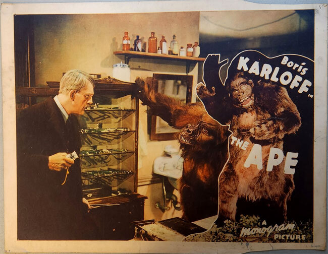 Not a repro, this is an original theatrical lobby card from 1940 for THE APE (1940), a Boris Karloff film. 11x14 inches. Features the monster gorilla in the sidebar. Two snips are clipped out of the border only, does not infringe on the image. Some small pin holes in the border. This card depicts Boris Karloff facing the gorilla!