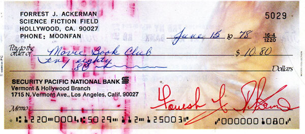 FORREST J ACKERMAN (5029-Movie Book Club) - Canceled Check & Autograph