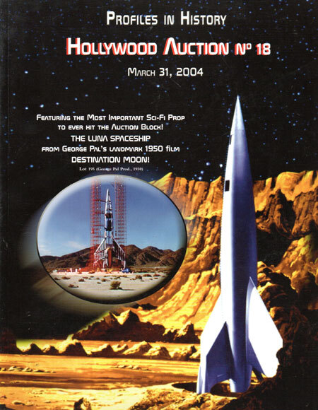 Glossy book featuring props and costumes from classic movies and TV shows. Items were on auction in year 2004. Page after page of striking photos of high end collectibles from film and TV. This auction featured the most important sci-fi prop to go on the auction block...from George Pal's 1950 film DESTINATION MOON. A beautiful book with hundreds of items. Costumes worn by Kim Novack, Sean Connery, William Hurt, Bette Davis, and many, many others. Props from sci-fi TV like THE INVADERS and scores more. A packed book of rare Hollywood items.