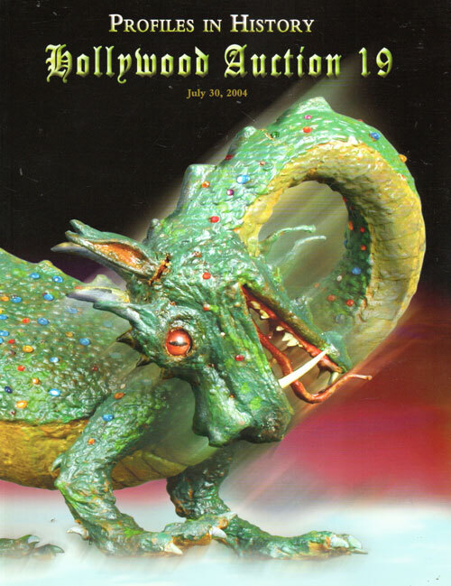 A full color on glossy heavy stock paper book of vintage movie oriented auction items. Eye-popping items like a five foot, seven inch CREATURE FROM THE BLACK LAGOON prop, RETURN OF THE VAMPIRE Bela Lugosi life cast, Gumby animation figure, PLANET OF THE APES facial appliances, many posters and lobby cards like one from THE MUMMY'S CURSE, from the cover - the jeweled dragon armature from THE WONDERFUL WORLD OF THE BROTHERS GRIMM...on and on. STAR TREK items...original scripts from movies and TV. A wonderful perfect bound book to peruse (and drool!).
