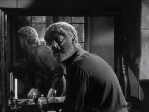 Okay, let's zip ahead a year to 1944. The movie is HOUSE OF FRANKENSTEIN. There's a bedroom scene where you see Lon Chaney, Jr. at a vanity mirror. He's transforming before your eyes to The Wolf Man. The transformation is awesome as the snarling werewolf mugs in the mirror. But, notice his hands. They never change. They are still just human hands. My guess is that director Earl Kenton simply thought the hands were not in the shot, out of frame.