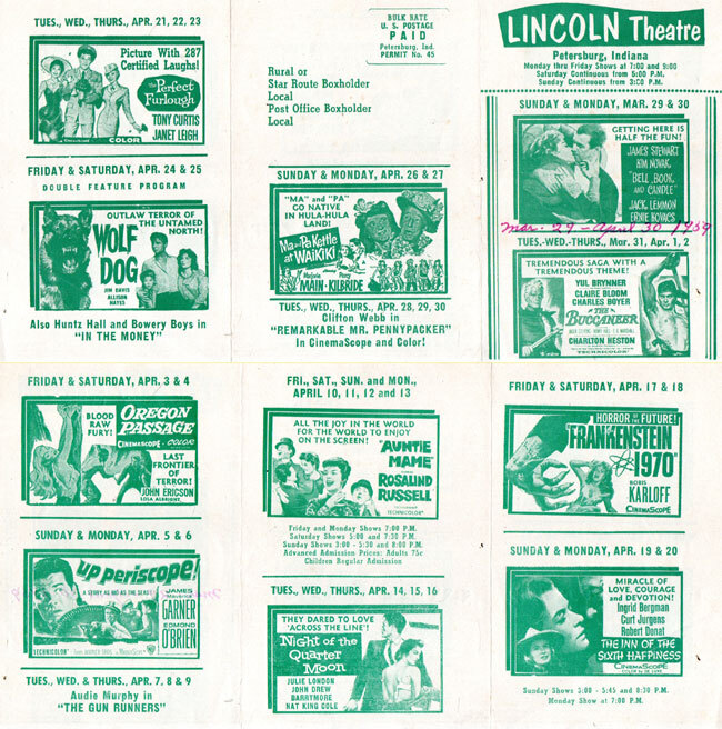 An original 5" x 10" tri-fold theatre ad sheet from March-April 1959. Printed on gloss paper with green ink. Some of the movies and show dates include: FRANKENSTEIN 1970 (1958) with Boris Karloff, UP PERISCOPE, WOLF DOG, BELL BOOK & CANDLE, MA & PA KETTLE AT WAIKIKI, and others. From the Lincoln Theatre in Petersburg, Indiana.