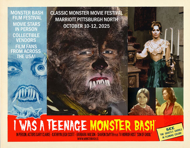 Guest stars that will be appearing are Gary Clarke (the teenage werewolf from HOW TO MAKE A MONSTER), Kathryn Leigh Scott (DARK SHADOWS), Barbara Wilson (TERROR IN THE MIDNIGHT SUN, THE FLESH EATERS, BLOOD OF DRACULA, THE MAN WHO TURNED TO STONE, and more!), Sharon Smyth (the original DARK SHADOWS ghost, Sarah)...plus, our BASH FAMILY regulars like legendary TV horror host SON OF GHOUL, Mark Statler, and more.
