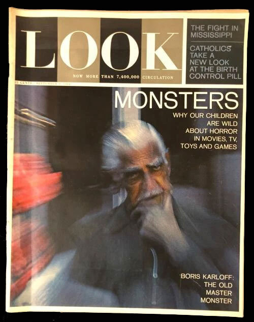 Besides the giant tri-fold images it included a copy of LOOK magazine from September 8, 1968, touting the MONSTER BOOM with Boris Karloff on the cover. And a photo copy insert from LIFE magazine featuring the popularity of classic monsters. The cover features a weird monster face that could be cut-out (perhaps getting TV station program directors to take it home and realize how much their kids would love it!). The cover proudly screams SHOCK-ING, ISN'T IT!!!
