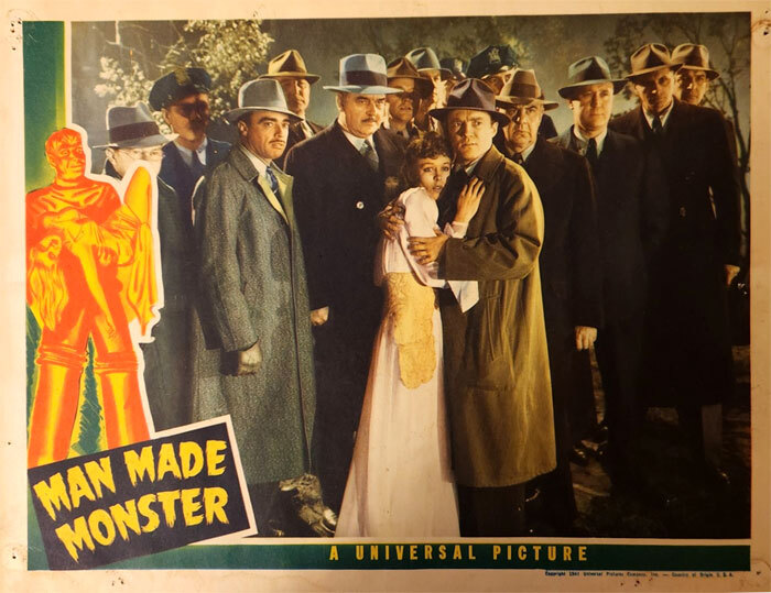 Not a repro, this is an original theatrical lobby card from 1940 for THE APE (1940), a Boris Karloff film. 11x14 inches. Features the monster gorilla in the sidebar. Two snips are clipped out of the border only, does not infringe on the image. Some small pin holes in the border. This card depicts the fearful townspeople.