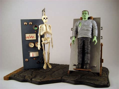 Snap-together monster model kit, part of the MONSTER SCENES collection! Contains a modular base, an adjustable operating table, a control panel, glow-in-the-dark skeleton, and hook. Make your own mad lab! 1/13th scale. Paint not included.