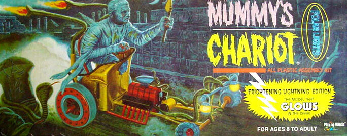 The all-plastic assembly kit! Build your own racing mummy in his chariot. This is the Frightening Lightning Edition from Polar Lights. The same design released bu Aurora back in the 1960s. Glue and paint not included. Requires assembly.