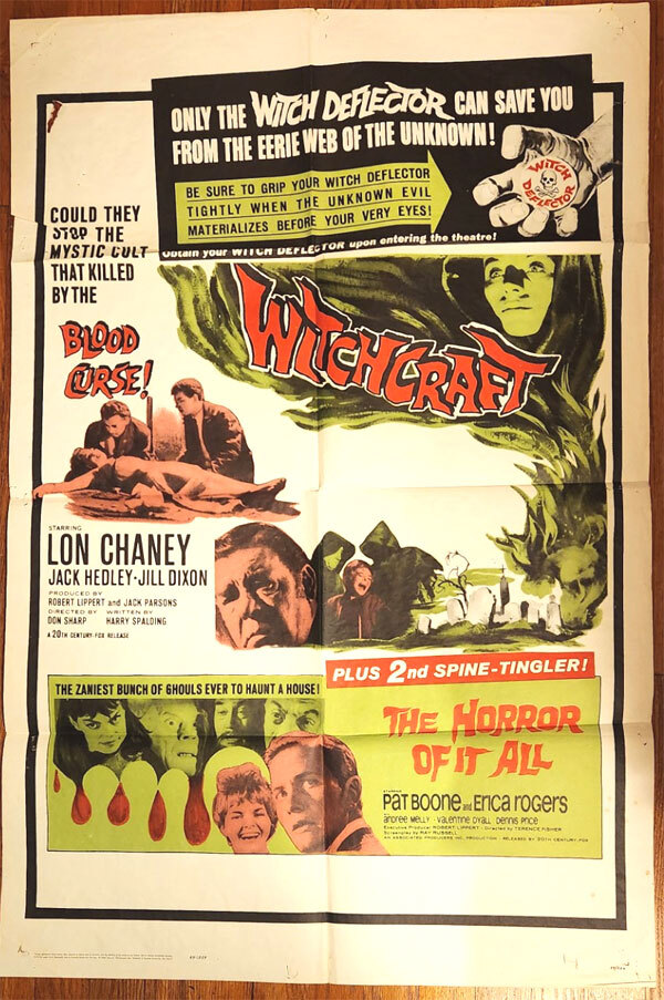 An original theater poster from 1964! 27 x 41 inches. Lon Chaney, Jr.'s WITCHCRAFT (Chaney pictured), and Pat Boone's chiller THE HORROR OF IT ALL. Some border pin holes from where the theater posted it. A small chip, and some very minor repair (about a one inch piece of tape). Click image to see larger detail. Not many of these theater originals survived the years!
